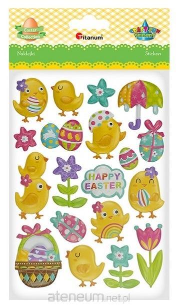 Naklejki wypukłe: kurczaki, pisanki, parasol, koszyk wielkanocny, kwiaty, napis "Happy Easter" 19 sztuk.