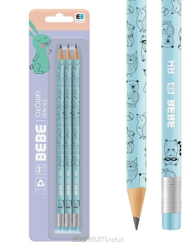 3 ołówki z gumką w pastelowym niebieskim kolorze na blistrze. Na ołówku zadruk z wizerunkami zwierzaków B&B z magicznego lasu. Trójkątny profil ołówka poprawia komfort jego użytkowania.