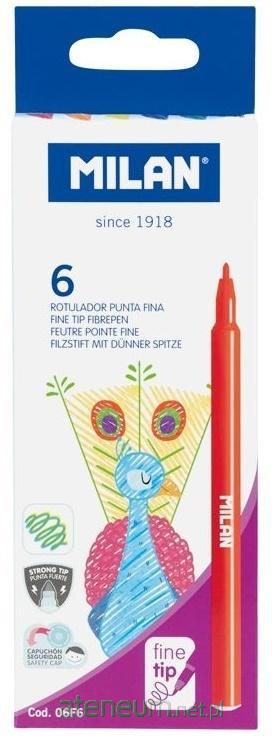 Flamastry z cienką końcówką o średnicy 2 mm. Szczególnie nadają się do rysowania konturów i pisania krótkimi pociągnięciami. Tusz na bazie wody tworzy jaskrawe i intensywne kolory, które można ze sobą mieszać. Tusz można łatwo wyprać z większości tkanin (moczyć tkaninę w zimnej wodzie przez godzinę, a następnie prać w pralce w niskiej temperaturze). Końcówka odporna na mocne przyciśnięcia. Bezpieczna wentylowana skuwka umożliwia oddychanie w przypadku połknięcia. Flamastry MILAN są zgodne z europejskimi i amerykańskimi normami bezpieczeństwa. Nie zawierają ftalanów, metali ciężkich i innych substancji toksycznych. Są bezpieczne dla dzieci. Rozmiar flamastra: 15,3 x 0,8 cm. Rozmiar opakowania: 18,8 x 6,4 x 1,2 cm.