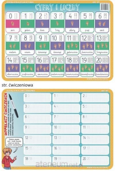 - edukacyjna podkładka ćwiczeniowa Visual System - do samodzielnych ćwiczeń - wypełniać cienkim mazakiem lub markerem do tablic suchościeralnych - treść można zmazać papierową chusteczką - dwustronnie foliowana - drukowana na kredzie 350 g - strona edukacyjna: cyfry i liczby 0-20 - strona ćwiczeniowa: pisanie cyfr i liczb