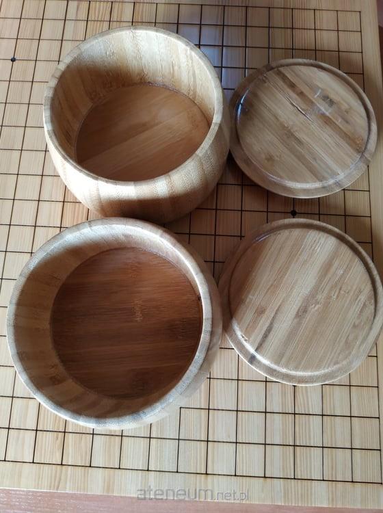 Elegancka para bambusowych gosu (pojemników na kamienie do gry w Go). W momencie, w którym nie widać kamieni na planszy, widać gosu. Gosu są tymi przyjemnym dla oka pojemnikami, które stoją na planszy wtedy, gdy nie grasz akurat w Go. Żeby zagrać w Go, potrzebne nam będą: plansza i kamienie. Oczywiście można kamienie wrzucić do jakiejś siatki, a podczas partii trzymać je luzem na stole. Jednak tak przechowywane kamienie szybko się gubią. I tutaj zastosowanie znajdują specjalne, praktyczne pojemniki na kamienie do gry w Go. Pojemniki te nazywają się po japońsku "gosu" i taka nazwa również przyjęła się w Polsce i innych "zachodnich" krajach. Ten ładny zestaw gosu to dwa pojemniki - jeden na kamienie czarne, drugi na kamienie białe. Gosu zostało zaprojektowane w taki sposób, żeby zmieścić i przechowywać pełny zestaw kamieni do gry w Go dla planszy 19x19. Waga gosu: 0,95 kg