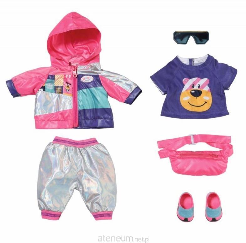 Tuuut! Tak brzmi sygnał do startu w wyścigu rowerowym Tour de BABY born. Mała zawodniczka zwraca na siebie uwagę stylowym trykotem. Na kurtce z kapturem widnieją jakże modne geometryczne kształty. Podobne motywy zdobią jej przeciwsłoneczne okulary. Kurtka idealnie pasuje do ciemnej koszulki z portretem niedźwiadka Bruno. Ponad butami sportowymi połyskują spodnie - mienią się w słońcu, niczym zdobyty w rywalizacji medal. W różowej saszetce na pasku BABY born schowała dokument potwierdzający udział w wyścigu i przekąskę z płatków owsianych źródło zdrowej energii. Wysokiej jakości ubranka do oryginalnych lalek BABY born. Dla ciekawszej, różnorodnej i niekończącej się zabawy. Prosty krój sprawia, że ubieranie i rozbieranie jest dziecinnie łatwe. Zestaw na rower BABY born Deluxe 43cm z kurtką, koszulką, spodniami, butami, saszetką na pasku i okularami przeciwsłonecznymi.