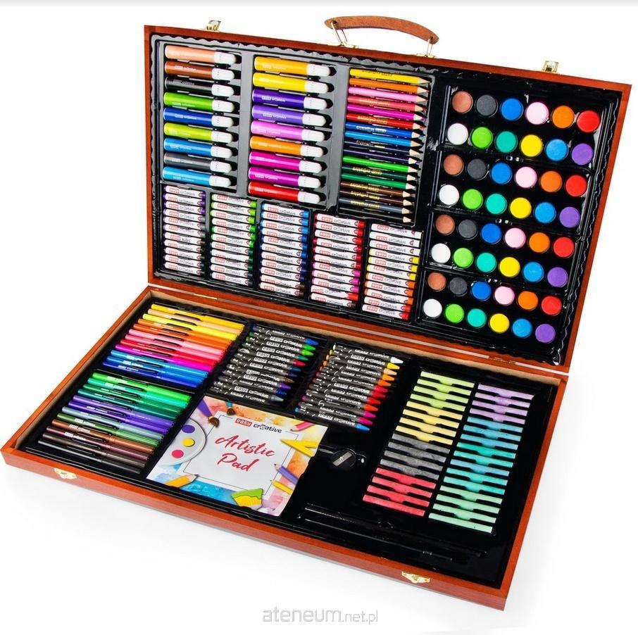 Zestaw artystyczny to doskonały początek przygody młodego artysty. Komplet jest funkcjonalny i składa się łącznie z 226 praktycznych elementów. Mnogość przyborów sprawi, że każde użycie zestawu artystycznego będzie doskonałą podróżą w świat sztuki. W skład zestawu wchodzą 48 farbek akwarelowych, 4 paletki, 17 mini kredek, 18 mini flamastrów, 55 pasteli olejnych, 32 kredy, 24 kredki świecowe, 24 flamastry, 1 temperówka, 1 ołówek HB, 1 pędzelek, 1 notatnik . Wykonane z najwyższej jakości materiałów przybory mają szeroką gamę kolorystyczną, co dodatkowo ułatwi wykonywanie prac plastycznych czy codzienny użytek. Całość została umieszczona w eleganckiej i praktycznej walizce, ułatwiającej przenoszenie i dodatkowo podbijającej walory estetyczne całego zestawu. Zestaw do malowania i rysowania to nie tylko obowiązkowy element wyposażenia każdego ucznia czy miłośnika kreatywnych zadań, ale także doskonały pomysł na prezent. Parametry: - 48 farbek akwarelowych, - 4 paletki, - 17 mini kredek, - 18 mini flamastrów, - 55 pasteli olejnych - 32 kredy - 24 kredki świecowe - 24 flamastry - 1 temperówka - 1 ołówek HB - 1 pędzelek - 1 notatnik