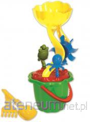 W zestawie: wiaderko, sitko, 2 foremki, grabki, łopatka, śr: 18 cm