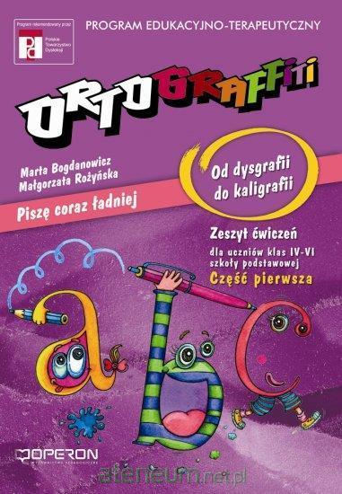 Seria ORTOGRAFFITI Kaligrafia cz. I. dla uczniów z dysgrafią z klas IV-VI szkoły podstawowej składa się z jednego zeszytu ćwiczeń przeznaczonego na semestr pierwszy. Zeszyt stanowi kompletną całość i wdraża do poprawnego pisania pod względem graficznym (czytelność, estetyka) oraz poprawia tempo pisania. Duży nacisk położono na rozwijanie funkcji wzrokowych, koordynacji wzrokowo-słuchowo-ruchowej, orientacji w schemacie ciała i przestrzeni oraz koncentracji uwagi. Każdy zeszyt został podzielony na 14 bloków tematycznych. Każdy z bloków utrwala wzór pisania grupy liter lub cyfr. Na końcu każdego zeszytu znajdują się prace domowe do samodzielnego wykonania przez ucznia utrwalające nowopoznane treści. Dodatkowo do każdego zeszytu ćwiczeń dołączono przydatne i ciekawe RADY KALIGRAFUSA DLA UCZNIA, KTÓRY CHCE KSZTAŁTNIE PISAĆ.