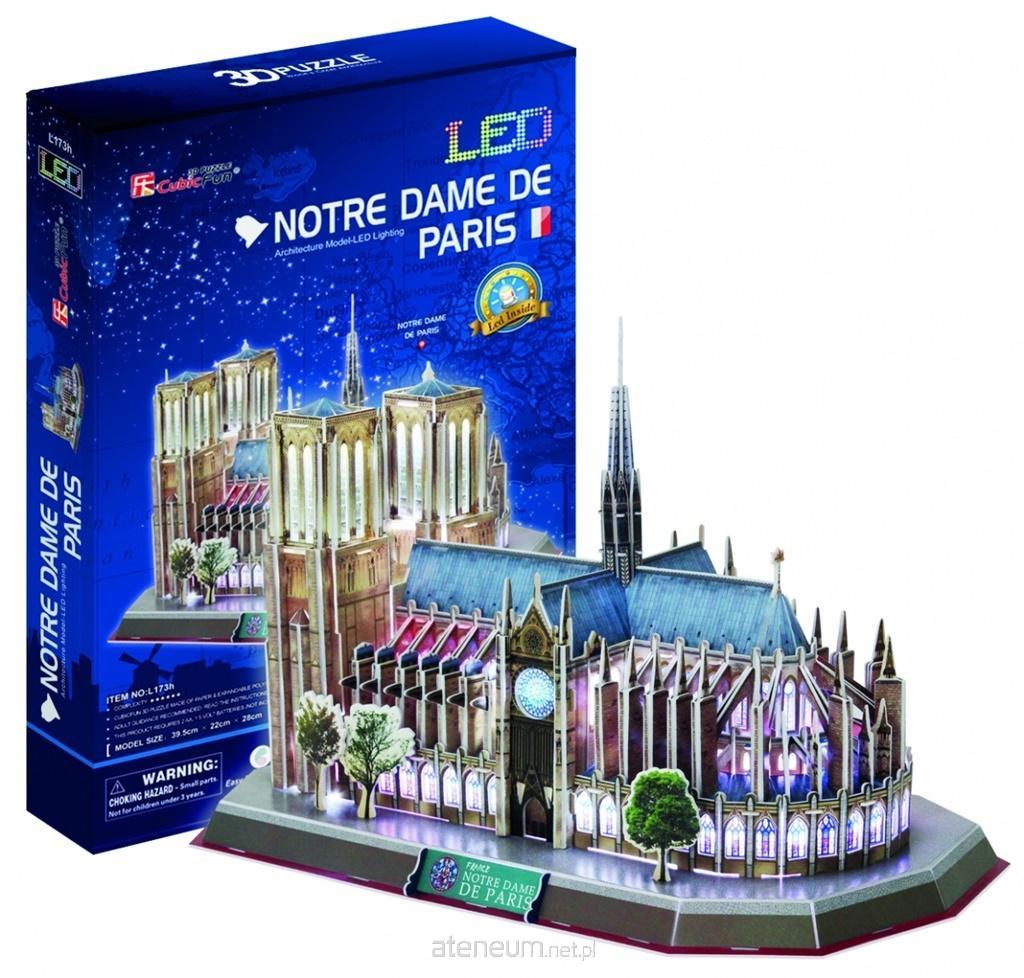 PUZZLE 3D LED KATEDRA NOTRE DAME, to pasjonująca zabawa dla dzieci oraz kolekcjonerów architektury z różnych stron świata. W opakowaniu znajduje się 149 EL. puzzli, wykonanych ze specjalnego materiału przypominającego piankę. Puzzle są ponumerowane, ponacinane i umieszczone na arkuszach. Wystarczy bez użycia siły wycisnąć element z arkusza i zmontować go zgodnie z dołączoną instrukcją, bez użycia kleju ani specjalnych narzędzi. Gotową budowlę stawia się na podstawce, w której znajdują się diody LED. Tak podświetlona budowla z puzzli 3D, przy zgaszonym świetle prezentuje się fenomenalnie. Wielkość budowli po złożeniu 39.5 x 22 x 28 cm. Zalecany wiek dziecka 8+.