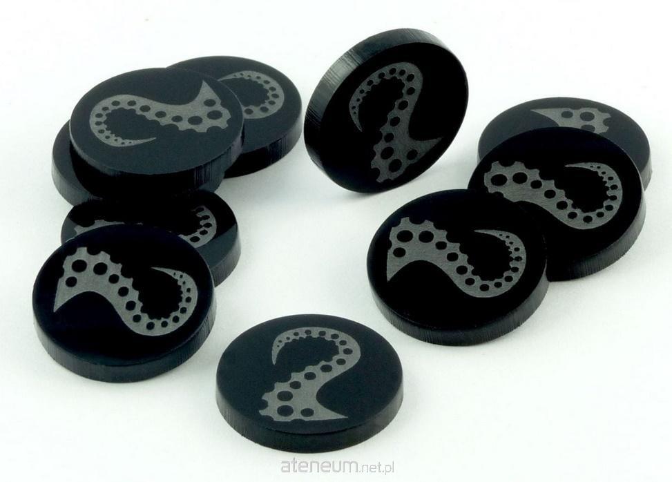 Żetony z wygrawerowaną grafiką macki w pierwszej wersji, wykonane z czarnego szkła akrylowego, o grubości 3 mm, średnica żetonu wynosi 22 mm. W opakowaniu jest 10 żetonów. Użyteczne w grach bitewnych, RPG, grach Print & Play, w prototypach gier planszowych, jako zamienniki elementów oraz przy wprowadzaniu własnych modyfikacji zasad do gier. Do czyszczenia PMMA (szkła akrylowego - plexi) nie należy używać żadnych środków na bazie alkoholi. Polecamy wodę z mydłem, a w przypadku silnych zabrudzeń cytrusowe środki czyszczące.