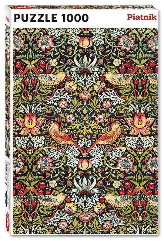 Wielkość obrazu po ułożeniu: 67,5 x 44,1 cm. Układanie puzzli to twórcza rozrywka bez względu na wiek. Rozwija spostrzegawczość, uczy wytrwałości i ćwiczy koncentrację. Jest wyzwaniem, z którym można zmagać się w pojedynkę lub w większym gronie. Motywem głównym tych puzzli jest charakterystyczna mozaika, stworzona przez angielskiego malarza Williama Morrisa - "Złodziej Truskawek".