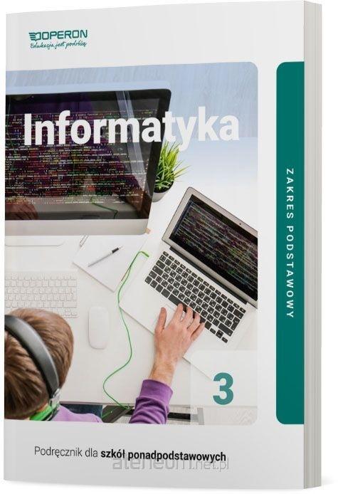 Podręcznik Informatyka 3 został przygotowany dla uczniów trzeciej klasy liceów ogólnokształcących i technikum; kontynuuje znaną już i popularną serię podręczników autorstwa Wojciecha Hermanowskiego. Poziom podstawowy zawiera treści pozwalające zrealizować wymagania przewidziane w podstawie programowej na ten poziom i jednocześnie kończy nauczanie tego przedmiotu w tym zakresie. Autor w ostatnim tomie skupia się na przekazaniu praktycznych informacji niezbędnych w codziennym życiu i wykorzystaniu nowoczesnej technologii w domu, w szkole i pracy. Uczeń ma możliwość zaprojektować profesjonalną prezentację, reklamę, użyć korespondencji seryjnej czy zastosować do swoich potrzeb arkusz kalkulacyjny. Zaletą proponowanych zadań i projektów jest ich korelacja z innymi nauczanymi przedmiotami, dzięki czemu uczeń widzi konkretną możliwość zastosowania przyswajanych treści. Każdy dział podręcznika zaczyna się od spisu tematów. Bezpośrednio pod jego tytułem znajduje się moduł Na tej lekcji, którego zadaniem jest ukierunkowanie na cele realizowane w tej jednostce. Hasła na marginesach to treści obowiązkowe do zapamiętania; zostaną powtórzone w podsumowaniu lekcji. Definicje wyróżniono kolorową czcionką. Każdy temat kończy się kilkoma zadaniami do rozwiązania, tym razem do pracy samodzielnej w domu, pozwalającymi sprawdzić stopień opanowania umiejętności oraz podsumowaniem lekcji w postaci syntetycznych punktów. Takie samo podsumowanie, ale z dużo większego materiału, bo z całego działu znajduje się na jego końcu i jest esencją najważniejszych wiadomości do zapamiętania. Schematy i rysunki zastosowane w publikacji mają pomóc w usystematyzowaniu wiedzy, a zrzuty ekranu pełnić funkcję tutoriali. Dzięki nim szybciej można zastosować omawiane zagadnienia w praktyce. Publikacja oprócz teoretycznych wskazówek pełni rolę praktycznego przewodnika.