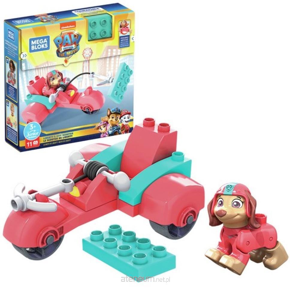 Zestaw konstrukcyjny inspirowany animacją ,,Psi Patrol Film" zawiera 10 małych, wytrzymałych klocków wraz z elementami specjalnymi, które pozwalają zbudować skuter miejski Liberty z hakiem.