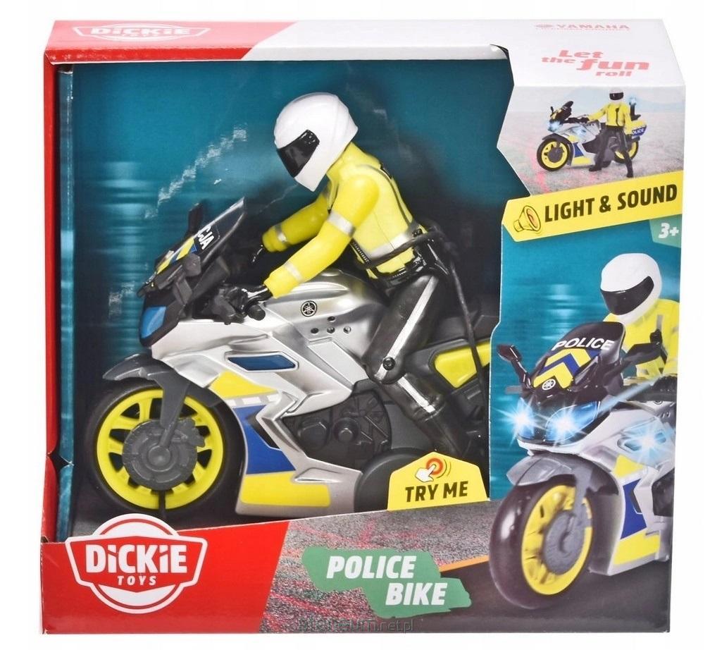 Motocykl Policyjny Światło i Dźwięk 3712018 od firmy Dickie Toys przenosi dynamiczną akcję z ulic prosto do pokoju dziecięcego. Pojazd wyposażono w efekty dźwiękowe - syrenę alarmową oraz towarzyszące im efekty świetlne - mrugający na niebiesko kogut oraz migające lampy. Do zestawu dołączona jest ruchoma figurka kierowcy, dzięki której dzieci w zabawny sposób odkrywają codzienne życie policyjne na dwóch kołach. Zabawka na licencji Yamaha. Zestaw z pewnością zachwyci każdego chłopca!