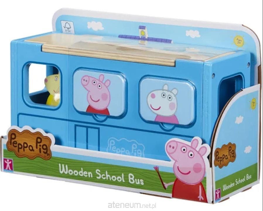 Peppa Pig - Drewniany autobus sorter Świnka Peppa Drewniany autobus szkolny Peppy zawiera 4 klocki o różnych kształtach, 4 obrazki do umieszczenia w oknie autobusu oraz drewnianą figurkę Rebecci Królika. Wykonane z przyjaznego dla środowiska drewna FSC.