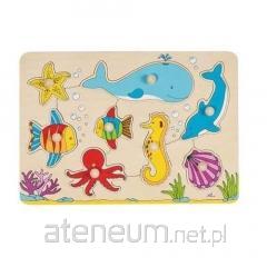 Zestaw zawiera drewnianą przebijankę do przebijania w obie strony, 6 klocków i drewniany młoteczek.