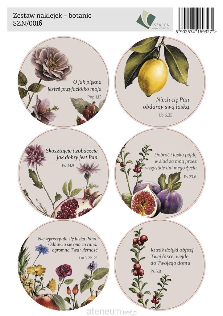 Zestaw naklejek z chrześcijańskimi hasłami w otoczeniu natury.