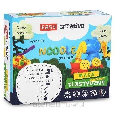 Zestaw masy plastycznej MAKARON. Zestaw zawiera 3 kubki z masą, maszynkę do robienia makaronu, 4 formy do różnych kształtów makaronu, miska, nożyk, łyżka, widelec, talerzyk.