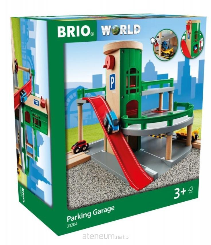Parking trzypoziomowy jest wspaniałym dodatkiem do każdego zestawu Brio i świetną zabawką dla małego miłośnika samochodów. Każdy poziom ma inną, ciekawą funkcję i daje nowe możliwości zabawy. Na pierwszy poziom prowadzi wjazd drogowy lub kolejowy, możesz tam zatankować swój samochód. Na drugie i trzecie piętro dostaniesz się za pomocą ręcznej windy, umieszczonej na środku parkingu. Użyj czerwonego pokrętła, aby wjechać na górę. Na drugim poziomie możesz skorzystać z zapadni, aby załadować samochód na specjalny wagon towarowy. Jeśli zaparkujesz na trzecim poziomie, czerwona rampa umożliwi Ci szybki zjazd w dół. Dołączone do zestawu dwa kolorowe samochody i wagon laweta są wyposażone w klasyczne złącza magnetyczne Brio, które umożliwiają łatwe połączenie z innymi pojazdami Brio.