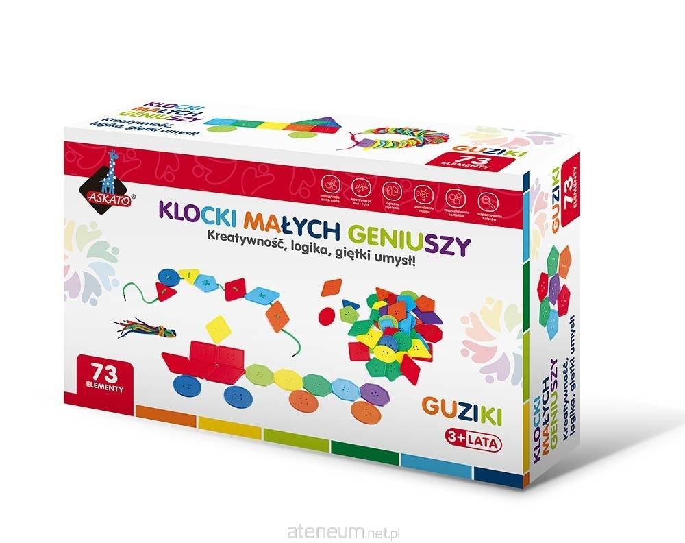 73 elementy w różnych kolorach pozwala stworzyć zabawne figury takie jak kwiatek czy samolot. Guziczki można również nawlekać na dołączone do zestawu sznureczki.
