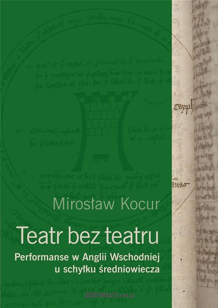 Teatr bez teatru omawia zupełnie nieznany w Polsce okres historii teatru angielskiego - widowiska z XIV i XV wieku. Praca ma charakter źródłowy, Mirosław Kocur przebadał niemal wszystkie zachowane teksty, na ich podstawie, posługując się narzędziami wywiedzionymi z performatyki, rekonstruuje średniowieczne przedstawienia. Opisuje nie tylko przestrzeń teatralną, ale i scenografię, kostiumy, i co najistotniejsze, sposób gry aktorskiej, a także reakcje widzów. Dokonuje klasyfikacji opisywanych przedstawień. Omówieniu każdemu z tekstów towarzyszy zarysowanie szerokiego kontekstu historycznego, społecznego czy politycznego.