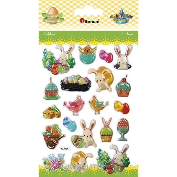 Naklejki wypukłe: zajączki, kurczaczki, pisanki, muffiny, koszyczki. Mix 20 sztuk.