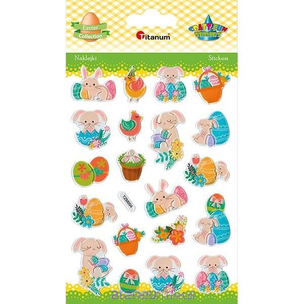 Naklejki wypukłe: zajączki, pisanki, koszyczki wielkanocne, ptaszki, 20 sztuk.