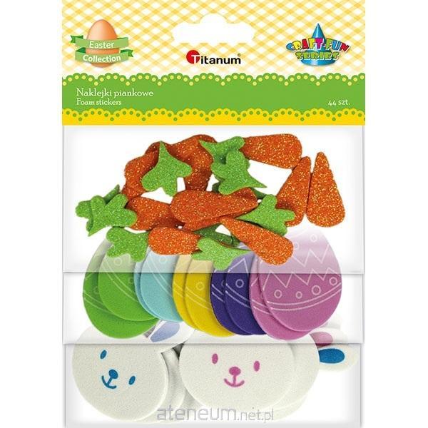 Naklejki piankowe marchewki 15 x 32mm, natki marchewki 20 x 22mm, pisanki 33 x 47mm, głowy zająca 39 x 48mm, 44 sztuki.