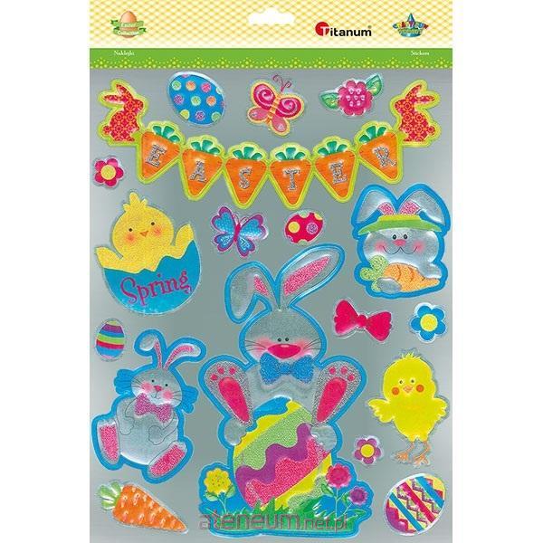 Naklejki foliowe metaliczne: baner Easter, zające, kurczaczki, pisanki, motyle 18 sztuk.