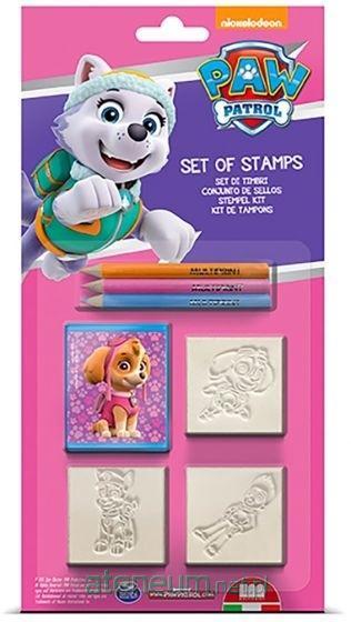 Pieczątki Psi Patrol dla dziewczynek. W skład zestawu wchodzą: 3 drewniano-gumowe pieczątki, 1 poduszeczka do tuszu i 3 kolorowe kredki ołówkowe.
