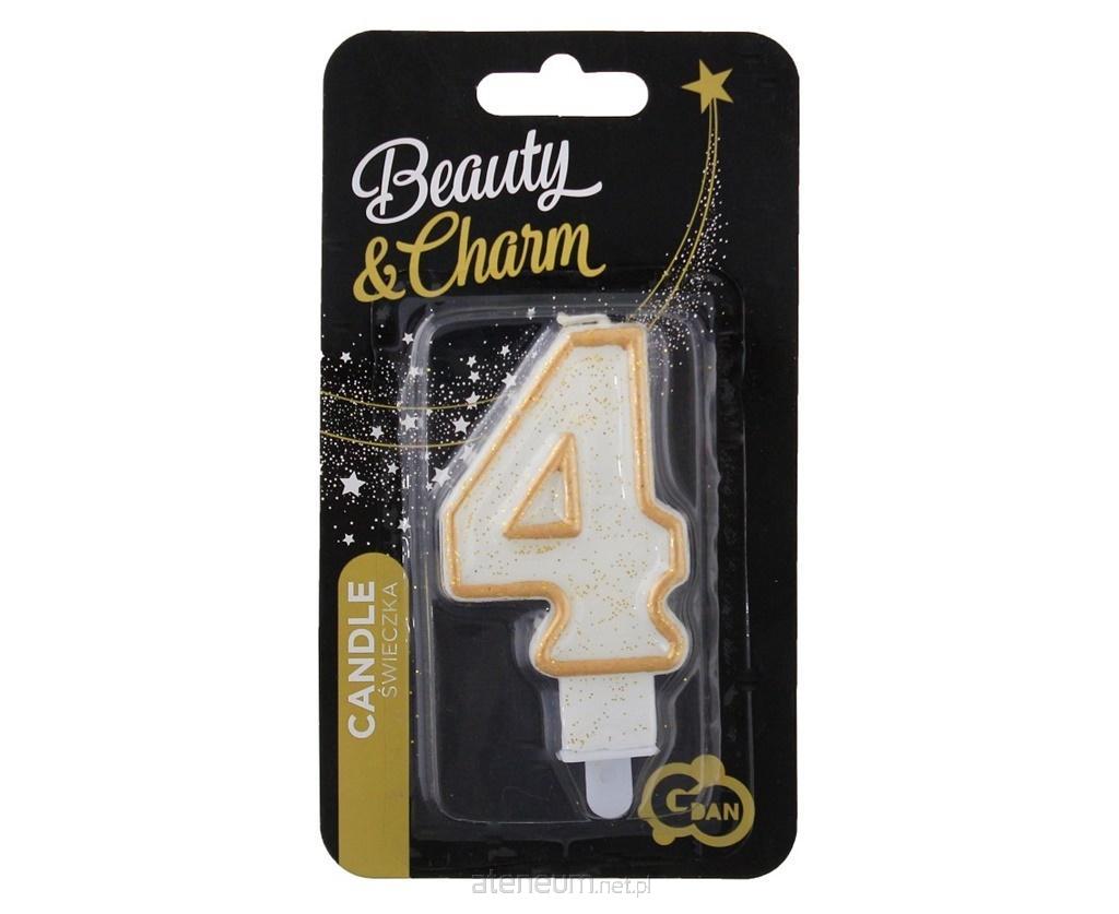 Świeczka CYFRA 4 urodziny, złoty kontur Wysokość świeczki: 6,5 cm Wysokość świeczki z podstawką: 9 cm Ilość sztuk w opakowaniu: 1 Kolor: złoty kontur Przepiękna świeczka Cyfra 4 złota to doskonała dekoracja każdego urodzinowego tortu. Świeczka w kształcie cyfry 4 (cztery) ozdobiona złotą brokatową posypką. Dzięki specjalnej stopce, świeczkę łatwo się umieszcza na torcie, dzięki czemu cyfra jest w całości widoczna a dziurka w torcie jest bardzo mała. Dodatkowo stopka zapewnia stabilność świeczki. Idealna ozdoba tortu dla dziecka i osoby dorosłej. Sprawdzi się także na wszelkiego rodzaju rocznicach, firmowych imprezach i wszędzie tam, gdzie z cyfr można ułożyć liczbę lub rok.