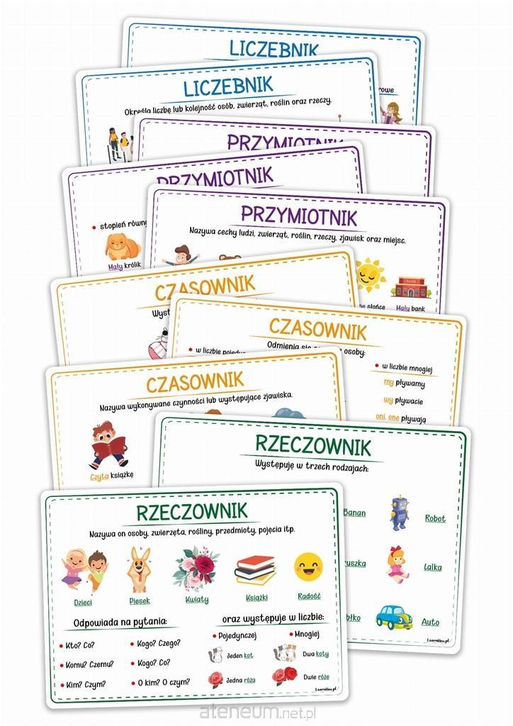 Części mowy jakie zawiera zestaw: rzeczownik, czasownik, przymiotnik, liczebnik.