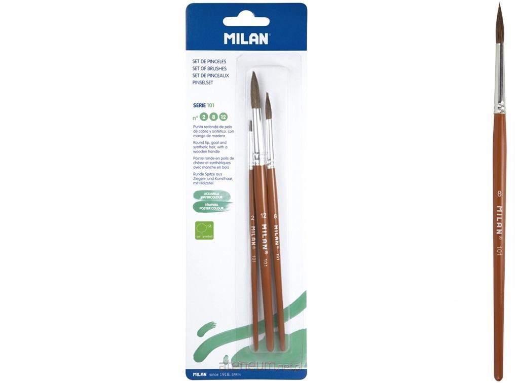 Zestaw 3 szkolnych okrągłych pędzli nr 2, 8, 12 serii 101 z krótkim drewnianym trzonkiem.