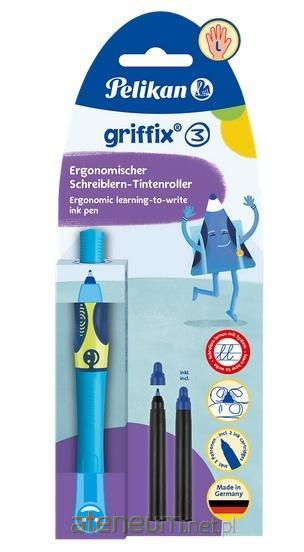Pióro kulkowe Pelikan Griffix to etap 3 w 4-stopniowym systemie nauki pisania stworzonym przez markę Pelikan. Po opanowaniu rysowania kredkami i pisania ołówkiem, dziecko jest gotowe na kolejny krok rozpoczęcie nauki pisania piórem. Na tym etapie dzieci nadal doskonalą chwyt szczypcowy, a jednocześnie zaczynają przyzwyczajać się do korzystania z narzędzia piśmienniczego z płynnym atramentem. Ponieważ młodsze dzieci mają tendencję do silniejszego naciskania na papier, pióro zostało wyposażone w specjalną końcówkę, która amortyzuje nacisk i umożliwia miękkie, płynne pisanie bez oporu. Widoczna uśmiechnięta buźka na korpusie podpowiada dziecku, że trzyma pióro prawidłowo. Ergonomiczny, trójkątny uchwyt pokryty został gumowaną powierzchnią, dzięki czemu dłoń się nie ślizga, a dziecko uczy się pisać w sposób wygodny i naturalny. Pióro działa na naboje atramentowe kulkowe, co czyni je czystym i łatwym w obsłudze.