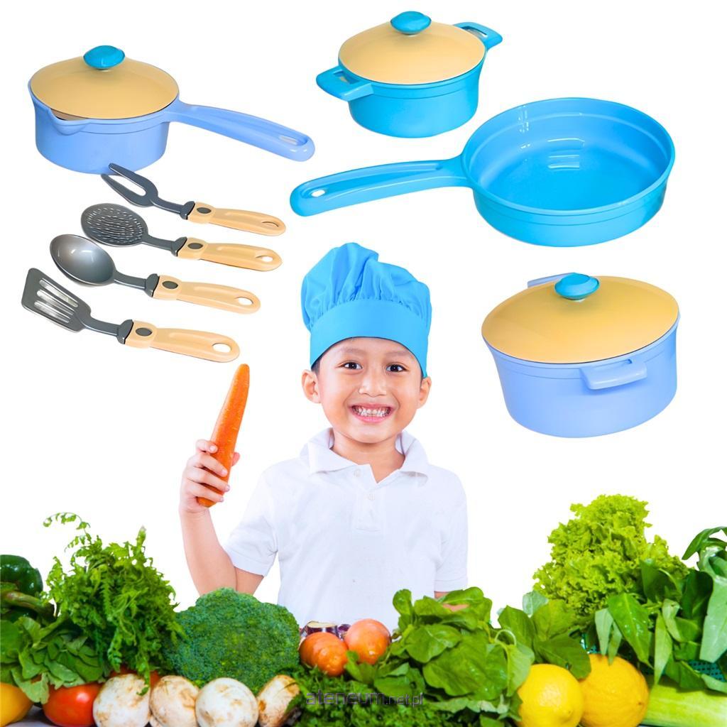 Komplet naczyń zabawkowych wykonany jest w nowoczesnej kolorystyce. W zestawie znajduje się łącznie 11 elementów, w tym: 2 garnki, patelnia, rondel, trzy pokrywki do nich, a także chochla, łyżka cedzakowa, duży widelec szefa kuchni i łopatka.