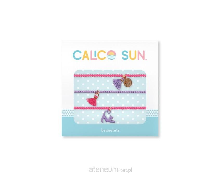 Trzy bransoletki z koralików w uzupełniających się odcieniach różu i fioletu ozdobione są dopasowanymi kolorystycznie frędzelkami i złotą zawieszką Calico Sun, a przewodnim akcentem w tym zestawie jest urocza, różowa zawieszka w kształcie kota.