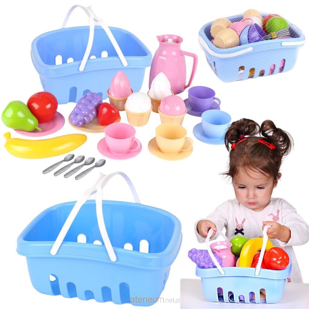W zestawie: kosz, dzbanek z pokrywką, 4 filiżanki ze spodeczkami i łyżeczkami, 2 talerze, 4 różne foremki w postaci "babeczek ze śmietaną", winogrona, jabłko, gruszka, banan, 2 truskawki .