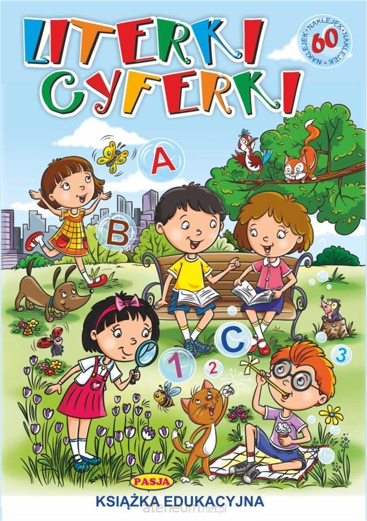 Książka edukacyjna - nauka pisania literek i cyferek. Teksty do czytania, kolorowanie, zadania logiczne. Zestaw 60 naklejek samoprzylepnych.