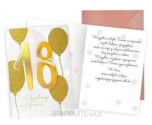 Karnet Dream Cards Plus "Urodziny 18" w powiększonym tzw. Angielskim formacie 140x190 mm. Kartka z ozdobnej serii Dream Cards Plus robi wrażenie dzięki atrakcyjnej kolorystyce i ciekawym zdobieniom. To idealny wybór łączący przyjazną cenę z jakością. Cechy szczególne: wielkość: 145 x 195 cm po złożeniu kopertą, wnętrze: kolorowe, wyjątkowe życzenia w środku, w komplecie: dopasowana kolorystycznie koperta. zdobienia: różnorodne, bogate (w zależności od wzoru: przyklejane dekoracje, elementy biżuteryjne, odstawniki, brokat, metaliczne folie, tłoczenia itp.), okazja: Osiemnastka