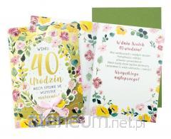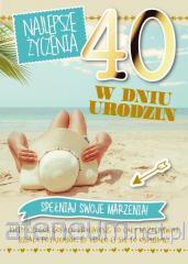 Karnet Dream Cards Plus "Urodziny 40-latka" DKP-022 w powiększonym tzw. Angielskim formacie 140x190 mm. Kartka z ozdobnej serii Dream Cards Plus na czterdzieste urodziny robi wrażenie dzięki atrakcyjnej kolorystyce i ciekawym zdobieniom. To idealny wybór łączący przyjazną cenę z jakością. Cechy szczególne: wielkość: 145 x 195 cm po złożeniu kopertą, wnętrze: kolorowe, wyjątkowe życzenia w środku, w komplecie: dopasowana kolorystycznie koperta. zdobienia: różnorodne, bogate (w zależności od wzoru: przyklejane dekoracje, elementy biżuteryjne, odstawniki, brokat, metaliczne folie, tłoczenia itp.), okazja: urodziny, 40 urodziny
