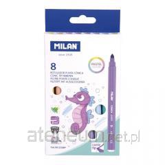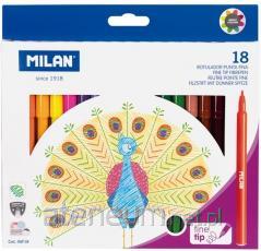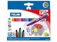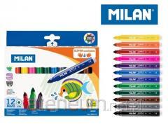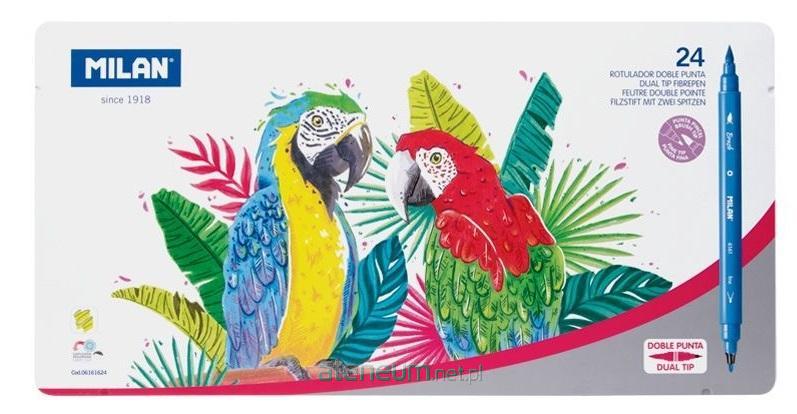 Flamastry DUAL TIP z dwoma różnymi końcówkami. Z jednej strony cienka końcówka (? 2 mm), jak we flamastrach nr 610 specjalnie dostosowana do rysowania konturów i pisania drobnymi pociągnięciami. Z drugiej strony wytrzymała, elastyczna, nylonowa końcówką w kształcie pędzelka. Idealna do kaligrafii, liternictwa i malowania zróżnicowanych kresek oraz mieszania kolorów. Pędzelkowa końcówka pozwala na rysowanie cienkich i grubych linii od 0,5 mm do 4 mm. 24 kolory w metalowym opakowaniu. Tusz na bazie wody tworzy jasne i intensywne kolory, które można ze sobą mieszać. Tusz można łatwo wyprać z większości tkanin (moczyć tkaninę w zimnej wodzie przez godzinę, a następnie prać w pralce w niskiej temperaturze). Bezpieczna perforowana skuwka, przezroczysta. Flamastry MILAN są zgodne z europejskimi (EN 71/III) i amerykańskimi (ASTM D4236) normami bezpieczeństwa. Nie zawierają ftalanów, metali ciężkich i innych substancji toksycznych. Są bezpieczne dla dzieci. Rozmiar flamastra: 15,6 x ? 1 cm.