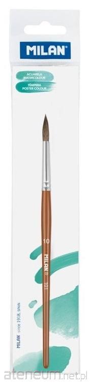 Szkolny okrągły pędzel serii 101 nr 10 z krótkim drewnianym trzonkiem. Skład: 70% naturalnego włosia koziego + 30% syntetyczne. Brązowe lakierowane wykończenie i aluminiowa skuwka bez spawania, odporna na rdzewienie. Bardzo miękkie włosie idealne do akwareli, technik wodnych i farb plakatowych. Lepsze zatrzymanie wody i farby. Gładsza linia. Lepsza odporność i elastyczność, co ułatwia odzyskanie kształtu po jego użyciu. Średnica włosia: 5,2 mm. Długość włosia: 23,6 mm. Długość pędzla: 195 mm.