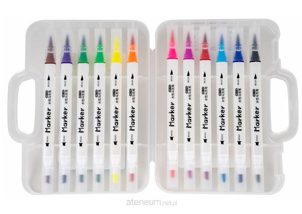 Zestaw 12 dwustronnych markerów w eleganckim plastikowym etui z uchwytem, końcówka pędzelkowa (3,2 mm) i ścięta (3,5 mm), jaskrawe kolory, kwadratowy profil korpusu, tusz na bazie wody.