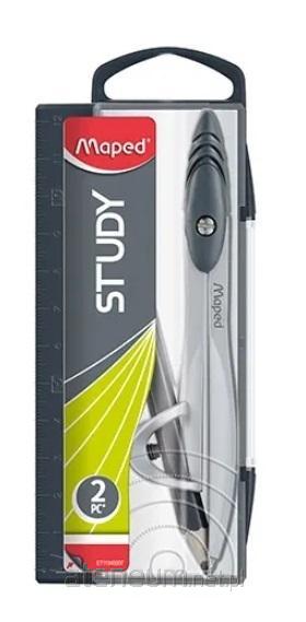 Metalowy cyrkiel STUDY z uniwersalnym uchwytem na ołówek. Plastikowe etui z wbudowaną linijką długości 12 cm zawiera cyrkiel STUDY oraz ołówek drewniany. Główka cyrkla w kolorze czarnym. JS.: 1 etui.