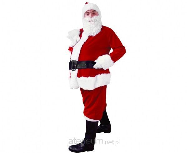 STRÓJ MIKOŁAJ LUX DLA DOROSŁYCH rozm. uniwersalny Zestaw zawiera: bluzę, spodnie, nakładki na buty, pasek, czapkę, rękawiczki oraz białą brodę. Wymiary: Długość spodni 104 cm. Długość pasa 57 cm. Długość bluzy 85 cm. Szerokość bluzy 79 cm. Długość rękawa 60 cm. Długość od pachy w dół 60 cm. Długość nakładki na buta 33 cm. Wysokość nakładki na buta 50 cm Obwód czapki 62 cm. Szerokość w pasie 150 cm. Strój Świętego Mikołaja w kolorze biało-czerwonym. Wykonana z miękkiego poliestru, zapinana na suwak. Czarne nakładki zakładane na gumkę, imitujące buty Świętego Mikołaja. Czerwona czapka ozdobiona białym puszkiem oraz pomponem. Dodatkiem dopełniający strój jest czarny pas z solidnie wykonaną klamrą oraz białymi rękawiczkami a do tego sztuczna biała broda.