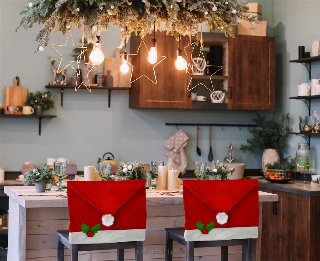 Pokrowiec na krzesło Czapka Mikołaja, 49x72 cm Ilość: 1 szt. Wymiary: długość całkowita 72cm, szerokość 49 cm Materiał: filc Pokrowiec na krzesło o wzorze czapki Świętego Mikołaja w kolorze biało-czerwono-zielonym. Wykonany z jakościowego filcowego materiału. Zdobiony zieloną naszywką na kształt gałązki jemioły oraz białym pomponem