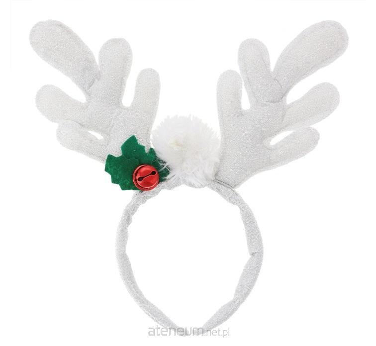Opaska ROGI RENIFERA, srebrna Długość rogów 17 cm. Rogi są usztywniane pokryte błyszczącym materiałem. Elastyczna opaska, pokryta filcem w kolorze srebrnym z przymocowanymi rogami, białym puszkiem i czerwonym dzwoneczkiem.