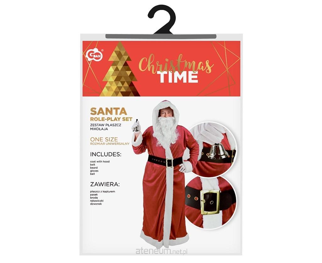 Strój Mikołaja welurowy (płaszcz z kapturem, pasek, broda, rękawiczki, dzwonek) rozm. un.