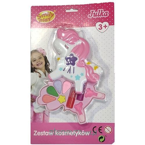 Pierwsze kroki w makijażu z kosmetykami dla małej księzniczki w formie rozkładanego jednorożca. Całości dopełnia czerwona pomadka do ust. Po złożeniu zmieszczą się do torebki małej damy.