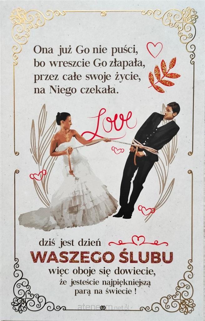 Karnet 5k z biletem to wyjątkowy pomysł na sprawienie młodej parze wesołej i niebanalnej niespodzianki. Wykonane z wysokiej jakości grubego papieru o gramaturze 350g i uszlachetnione złoceniem oraz tłoczeniem i brokatem. Oryginalne i wesołe teksty zaskoczą parę młodą i z pewnością wywołają uśmiech na ich twarzach. Karnet może być idealnym dodatkiem do każdego prezentu. Karnet zawiera również humorystyczne życzenia.