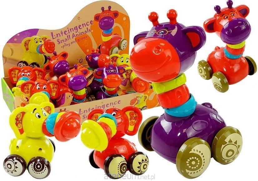 Kolorowe zwierzaki posiadają ciekawe urozmaicenia. Słoń na trąbie trzyma trzy gumowe pierścienie, a na końcu ma plastikowy kapelusz. Szyja żyrafy też ozdobiona jest krążkami z gumy w kolorze czerwonym, turkusowym i zielonym. Trąba słonia i szyja żyrafy zamocowane są na gumie, dzięki czemu możemy je rozciągać. Podczas zabawy wesoło grzechoczą.