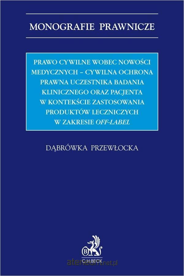 Monografia Prawo cywilne wobec nowości medycznych - cywilna ochrona prawna uczestnika badania klinicznego oraz pacjenta w kontekście zastosowania produktów leczniczych w zakresie off-label omawia obowiązujące w Polsce regulacje prawne pod kątem ochrony cywilnej uczestnika badania klinicznego oraz pacjenta, wobec którego zastosowano produkt leczniczy wprawdzie dopuszczony do obrotu, jednak niezgodnie z zakresem zatwierdzonym w oficjalnej procedurze dopuszczenia produktu leczniczego na rynek.
