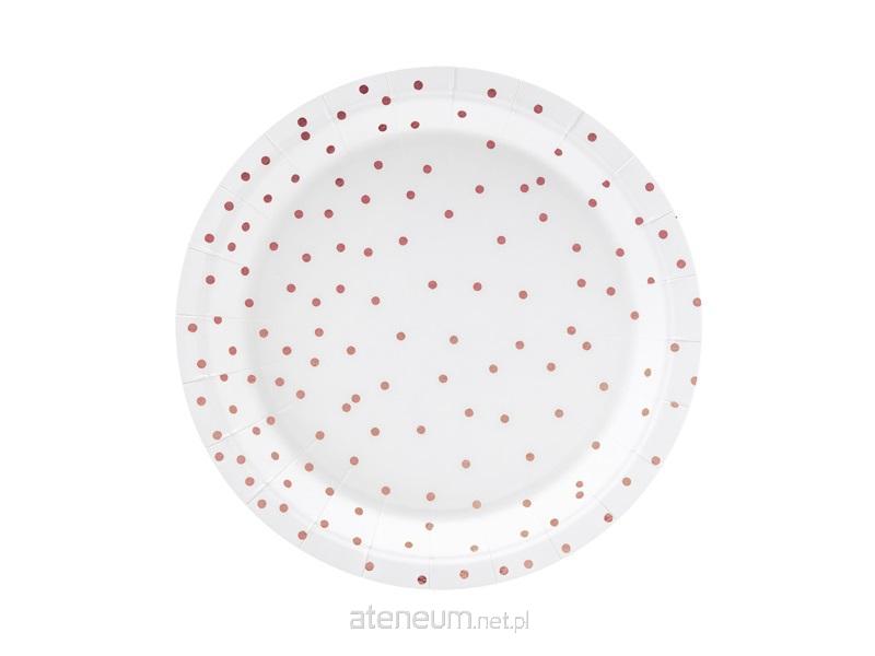 Białe talerzyki papierowe ze wzorem kropek w kolorze różowego złota, średnica ok. 18 cm.(1 op. / 6 szt.)